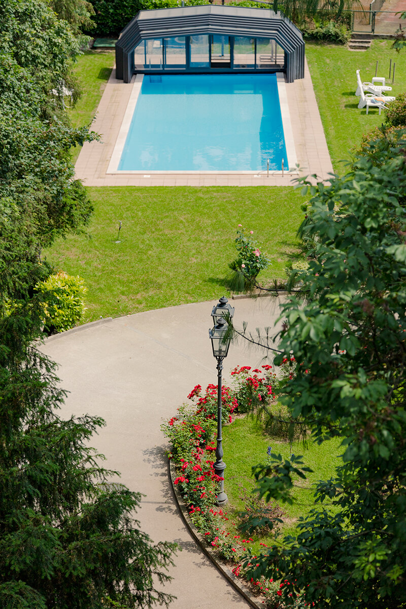 La proprietà impreziosita da una piscina (6x16 m e profonda 2 m) coperta da un'elegante struttura in ferro e vetro in perfetto accostamento con lo stile dell'edificio.